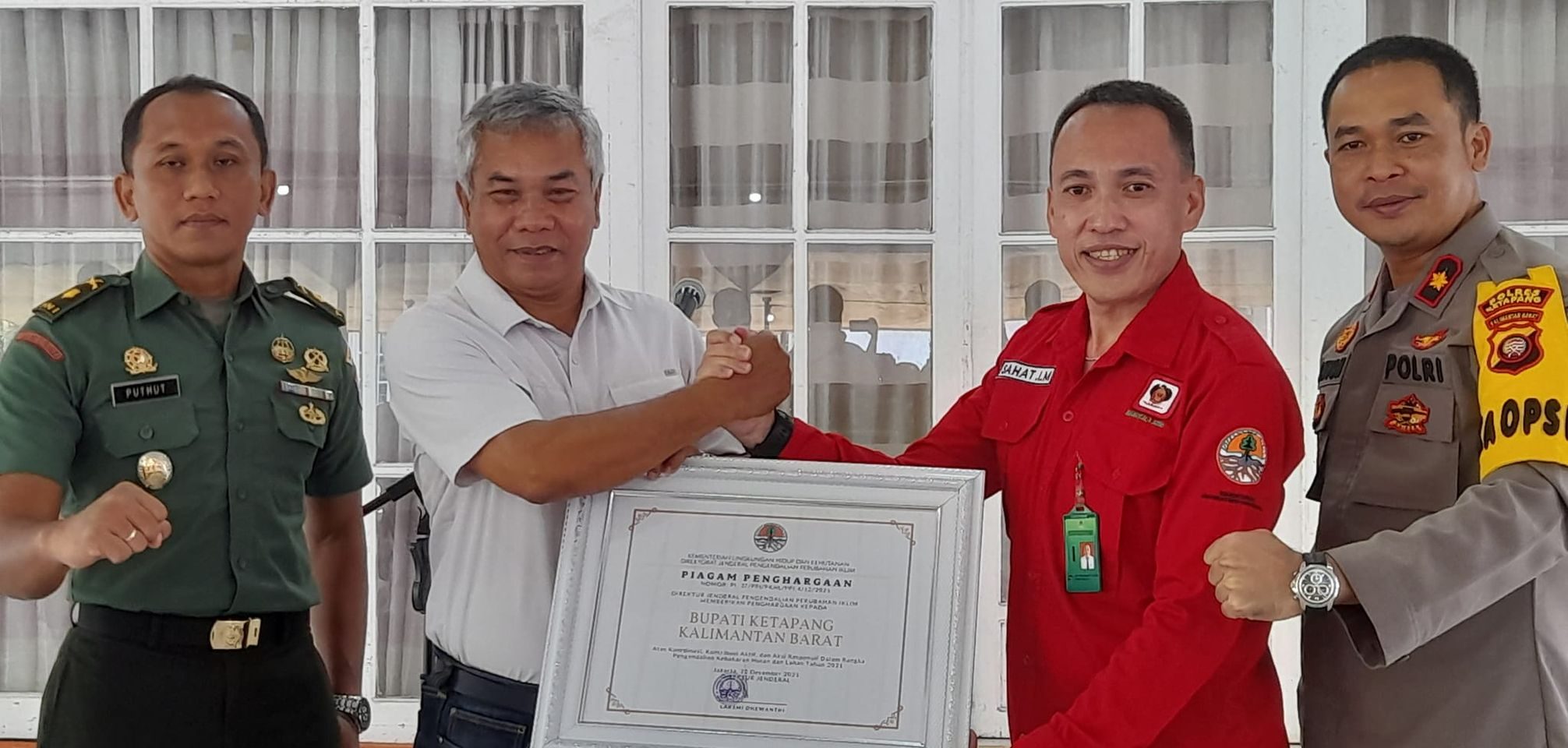 BUPATI Ketapang Martin Rantan menerima penghargaan dari Kementrian Lingkungan Hidup dan Kehutanan RI atas koordinasi kontribusi Aktif dan aksi responden dalam rangka pengendalian kebakaran hutan dan lahan tahun 2021.